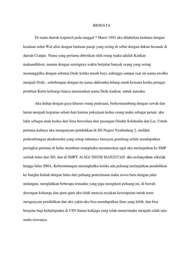 Kita tidak perlu bingung memikirkan apa yang harus kita tulis. Secara singkat biodata merupakan data biografis yang di dalamnya memuat pernyataan faktual tentang kehidupan. Penulis ikut tergerak untuk menyumbangkan tulisannya. Biodata narasi itu adalah biodata yang ditulis seperti cerita, berbentuk paragraf. Biodata penulis akhmad muhibudin adalah nama penulis skripsi ini. Bukan ditulis pakai tanda titik dua, lho, ya. Hal yang tak kalah penting adalah menuliskannya dengan runtut dan jelas. Hello, my name is patrick sendy. Contohnya, saat kita ingin menjelaskan tentang sebuah pemandangan yang ada di depan kita. Peserta lomba biasanya diminta untuk melampirkan biodata narasi di akhir sebuah karya yang dilombakan. Ya seperti menulis cerpen gitu. Pertanyaan seperti ini sering kali muncul dalam sebuah perlombaan menulis. Ia adalah alumni sma negeri 12 bandar lampung lampung.