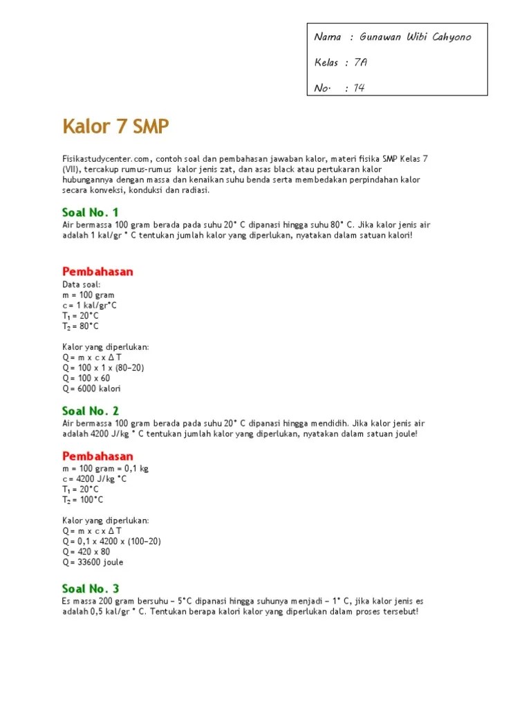 Materi suhu, kalor dan perpindahan kalor, asas black dan konversi suhu di soal ujian nasional (un) ipa fisika smp. Tingkat kesukaran 0,40, dan daya pembeda soal 0,33. Kalor diukur dalam satuan kalori. Materi kalor indikator soal peserta didik dapat menjelaskan pengertian . Satu kalori adalah jumlah energi panas yang dibutuhkan untuk menaikkan suhu sebesar 1 °c dari 1 gram air.